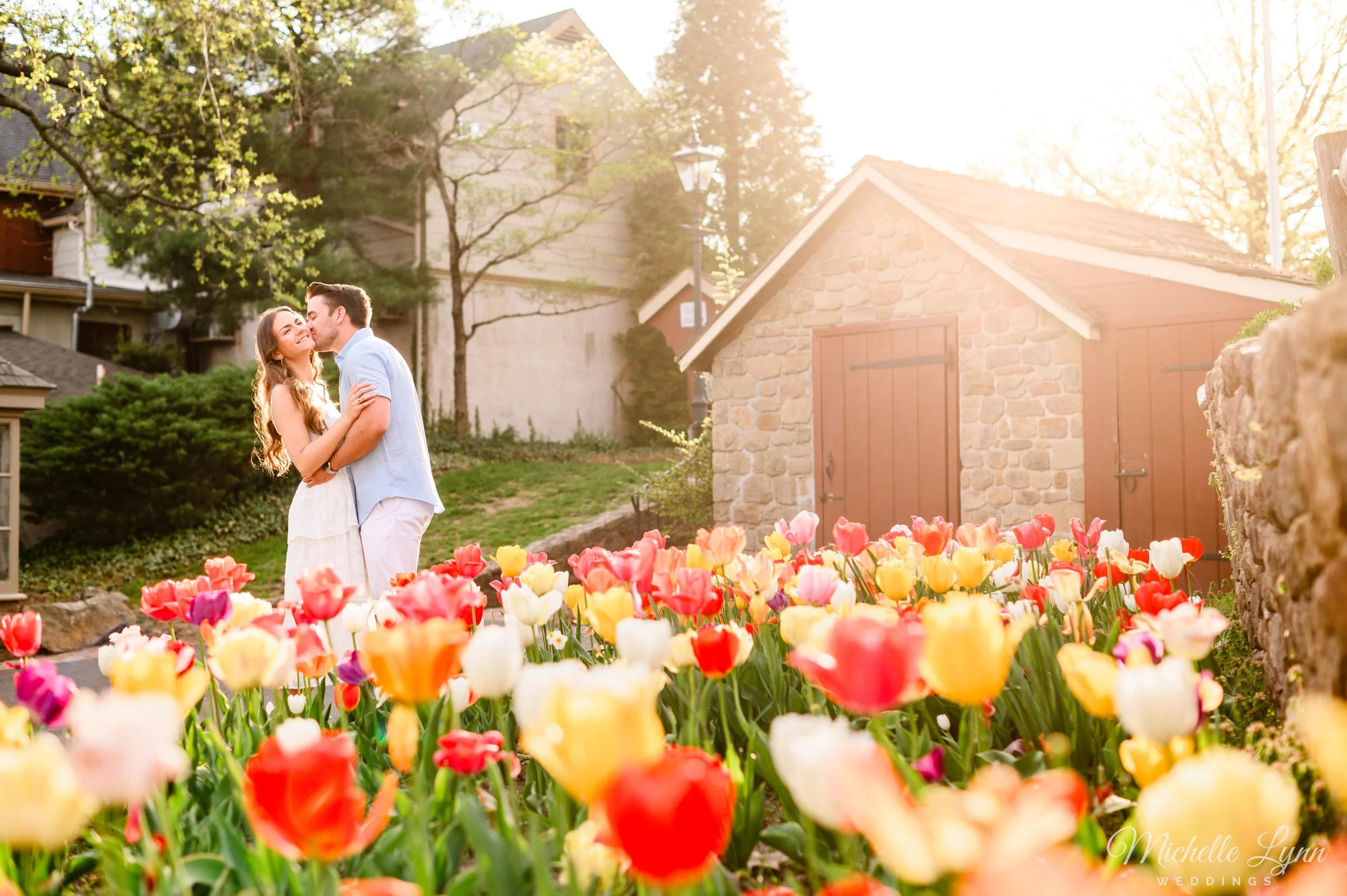 Catie and Nick's gorgeous springtime engagement session took place at Peddler's Village in Lahaska, PA. It was a beautiful sunny day, and the tulips were in peak bloom. The vivid colors created an incredible setting for their portraits! We had a great time walking around Peddler's Village taking their engagement photos, and we ended the session with drinks at Free Will Brewing.